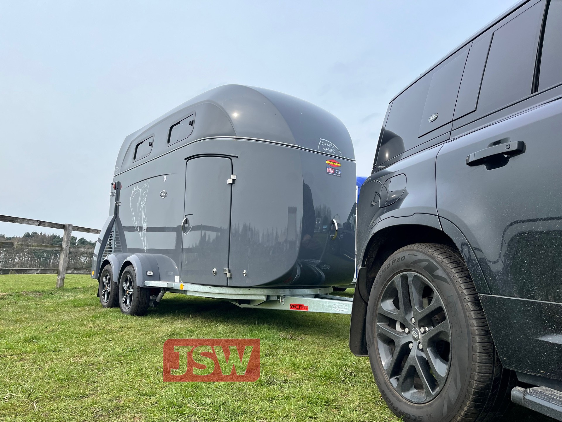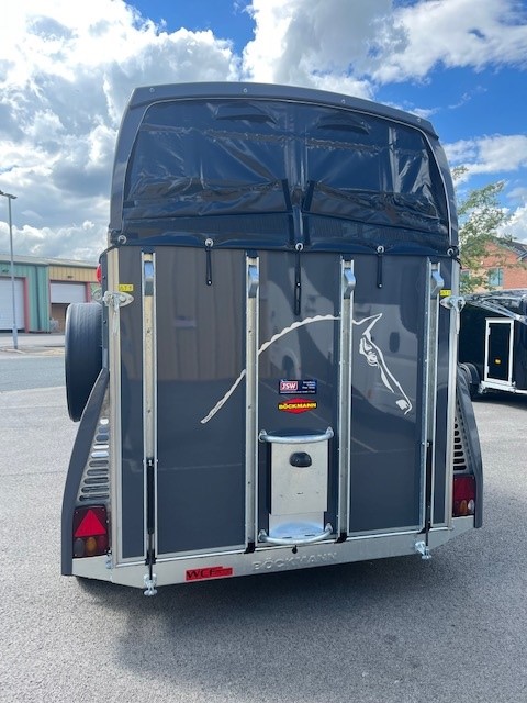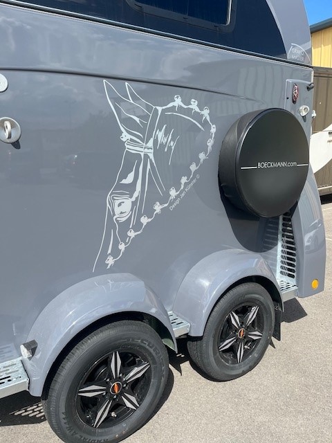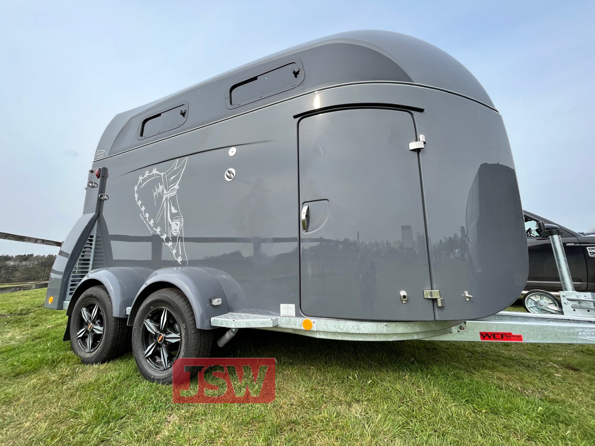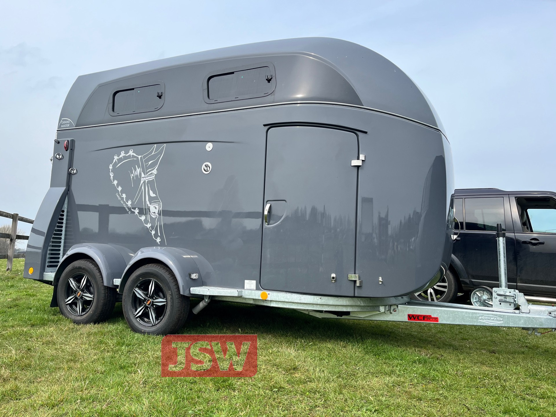 SPEC: Our trailer is the non-standard colour of Slate Grey gloss, with colour co-ordinating roof-line, matching side braces and single wheel arch fenders. It also boasts the super large grey Competition horse decor. Comfort travel floor mat. With the ‘Walk-in” tack room which is kitted out as shown including a 12v socket. Such a stunning and head turning box, seeing is believing, you need to see this trailer in the flesh to warrant German quality and design.