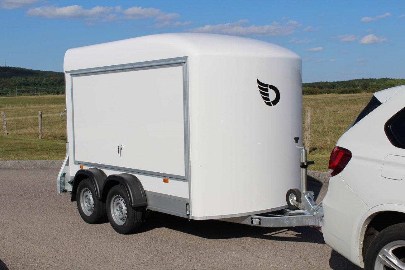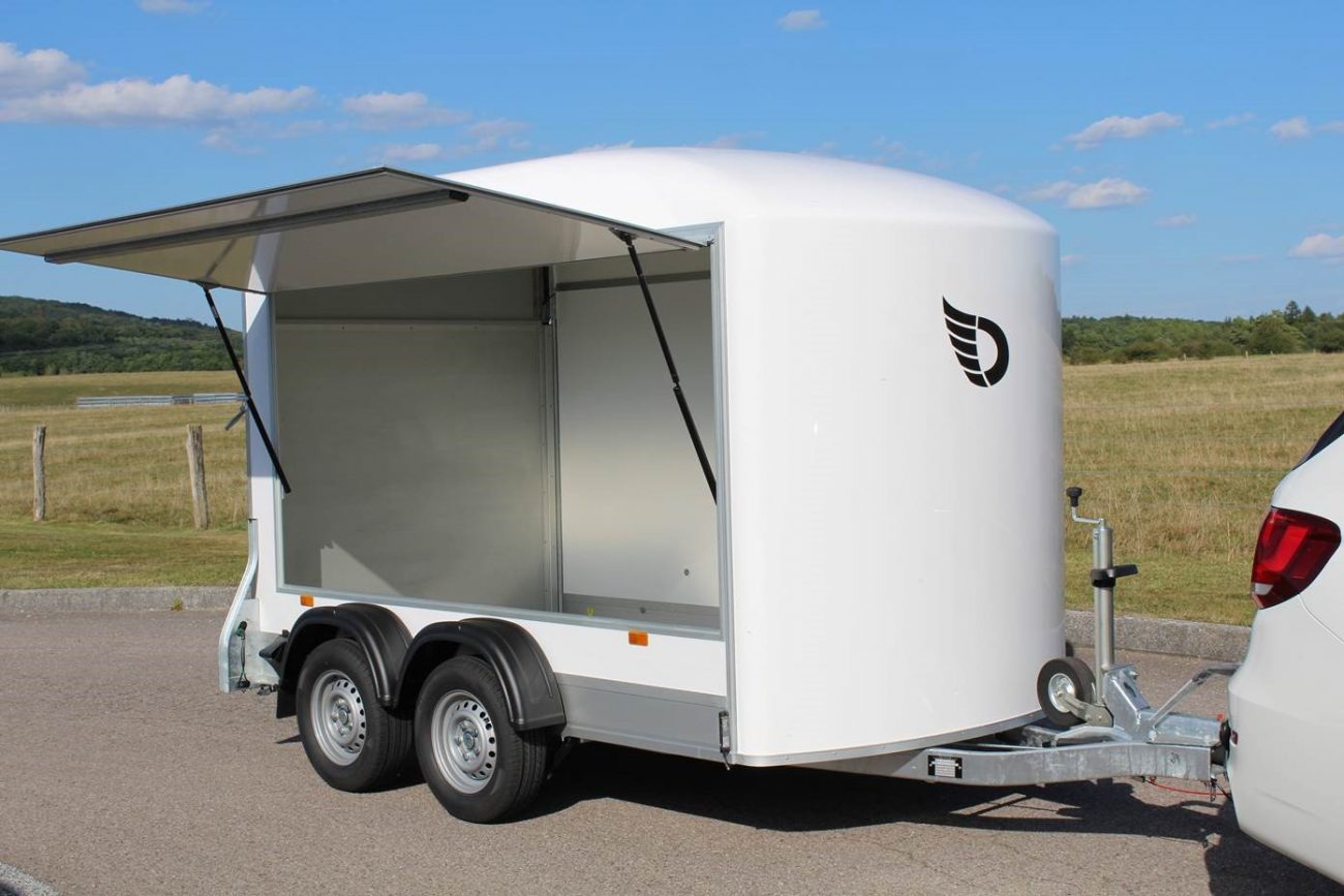 The Roadster Debon C500 Box Trailer with vending flap, and lockable side opening door, Pullman2 Suspension. Fibreglass Colour white including spare wheel.