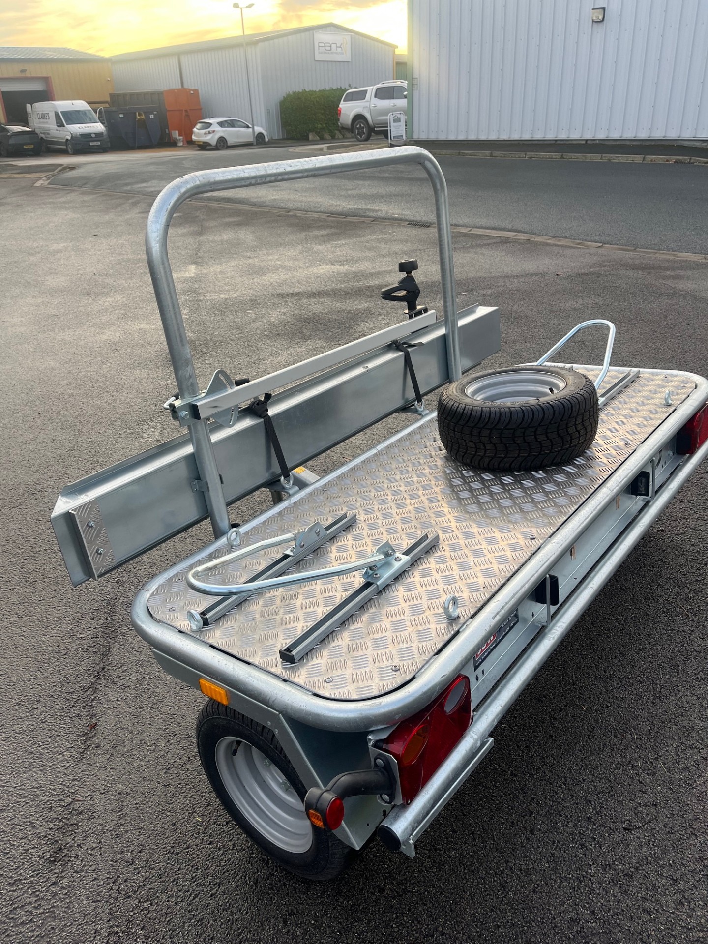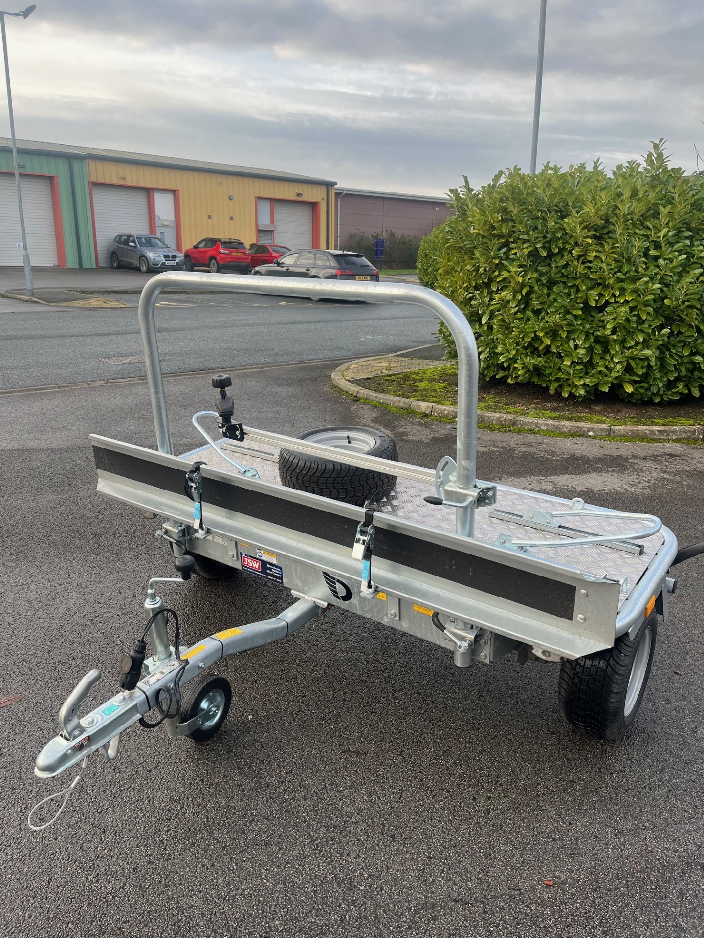 JUST IN We have a 7 month old, used once Debon MOTO Compact Transverse Side loading Bike Trailer, with spare wheel & motorcycle chock just arrived in. Used only once, this owner called in after the Motorcycle Live Show at Birmhingham and part exchanged for the MOTO1. Immaculate and looks brand new. NO VAT on this trailer.